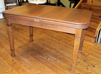 Wunderschöner Esstisch, 3-fach ausziehbar, musste wegen Lagerung in einer Gartenlaube neu furniert werden. Im Zuge der Aufarbeitung wurde auch das Untergestell geschliffen und im Naturton belassen. Durch die geniale Ausziehmechanik lässt sich der Tisch ganz leicht auf 320cm Länge vergrößern.